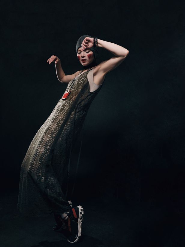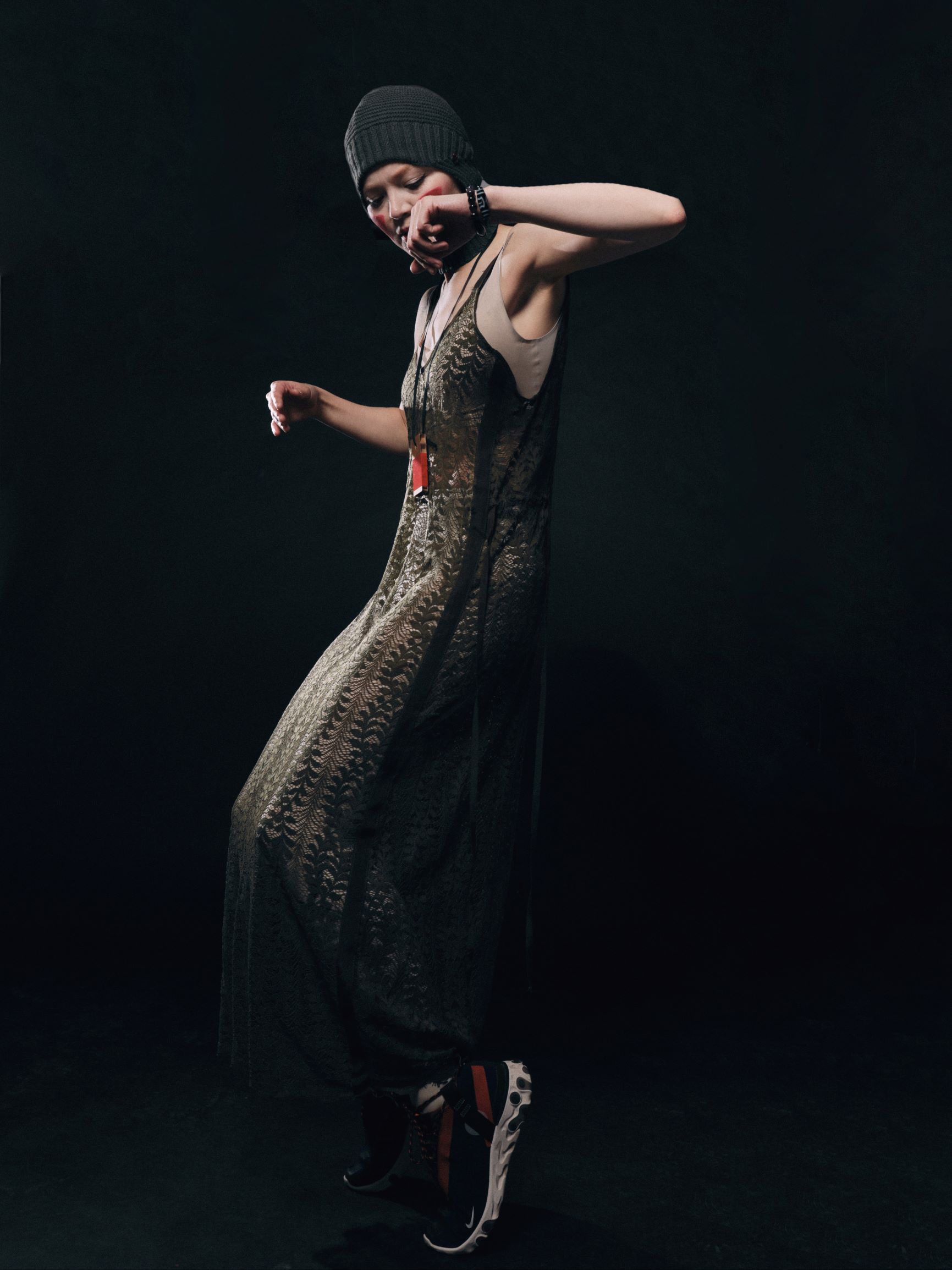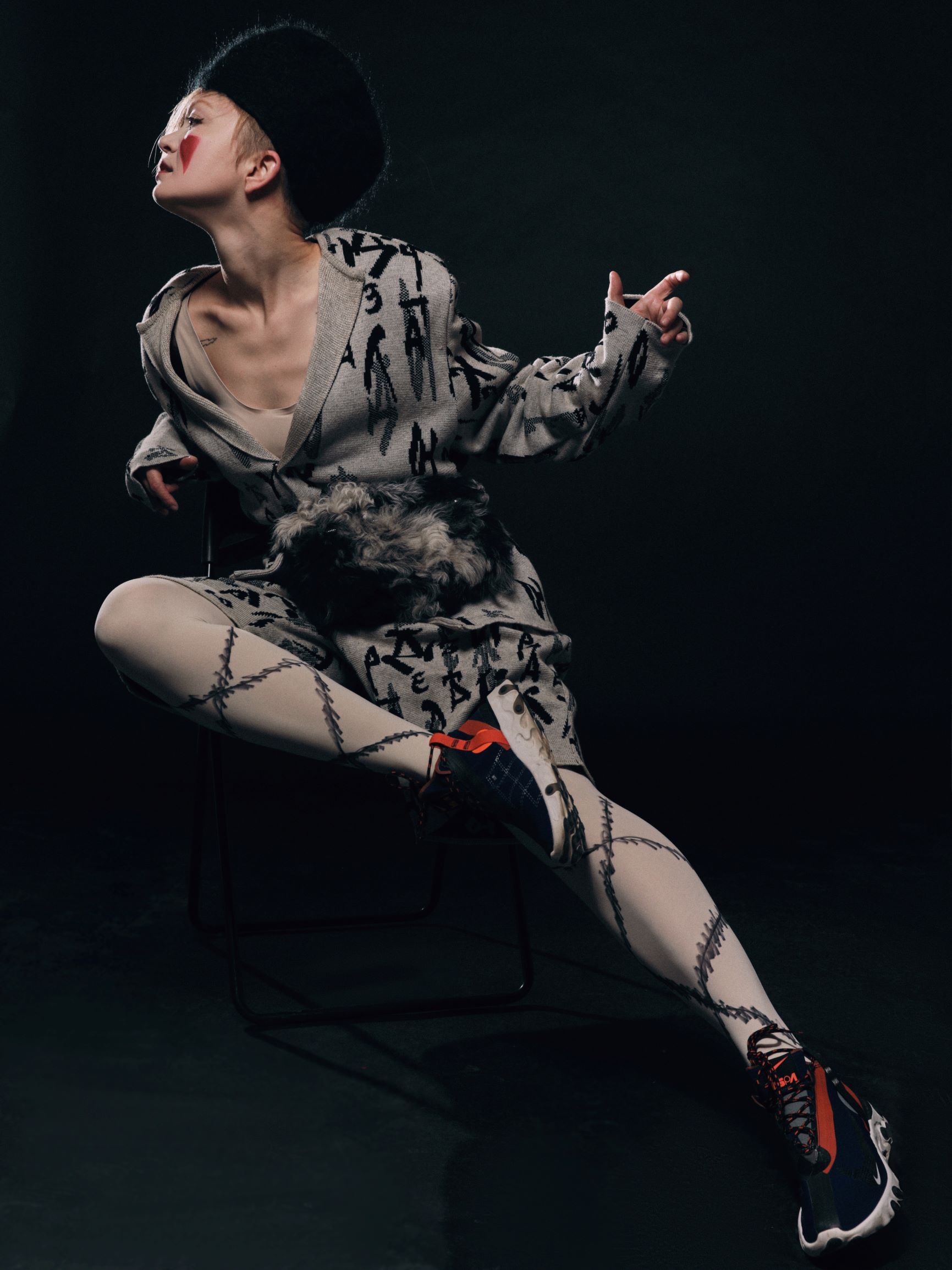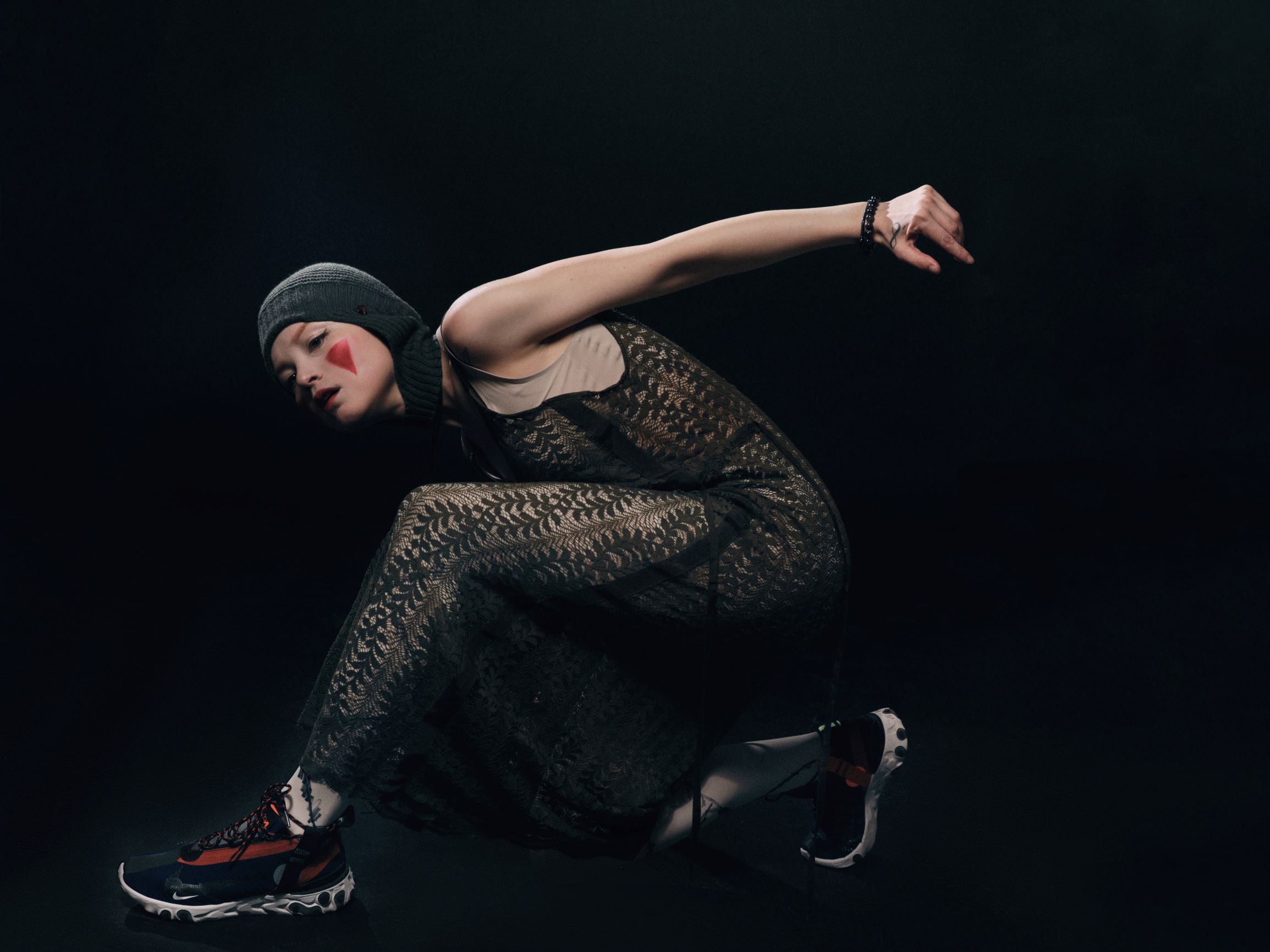 Понятнее всего было с балетными лаптями. Я сразу знала, что это будут кроссовки, причем именно Nike React. У меня есть такие беговые, самые первые, синего цвета. Это модель с чудесной подошвой, которая делает заземление по Александру Лоуэну — то, что мне как модели в этой съемке было очень нужно. Кроме того, реакты компактные, и формой похожи на изящные балетные лапти оригинального костюма.